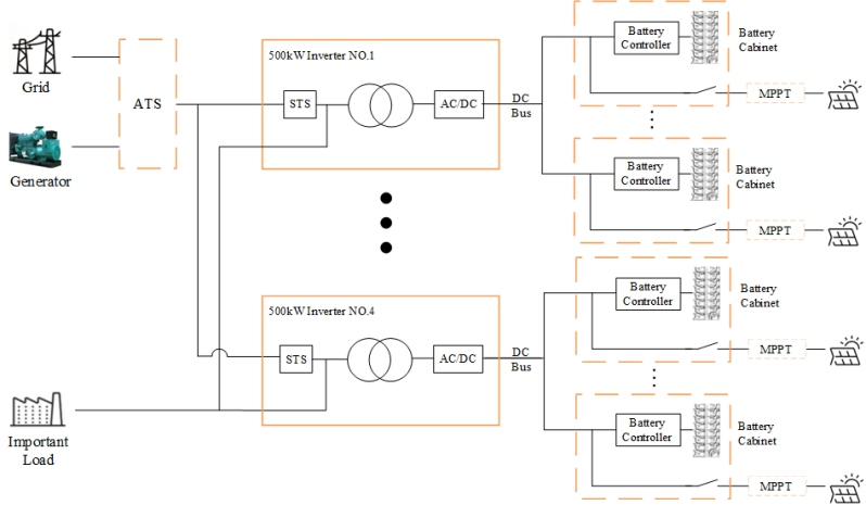 2. Ved parallell drift av flere 500 kW-systemer og distribusjon av STSa på tvers av forskjellige 500 kW-vekselrettere, er det avgjørende å sikre at kabellengden fra nettforbindelsespunktet til lasttilknytningspunktet er konsistent;
